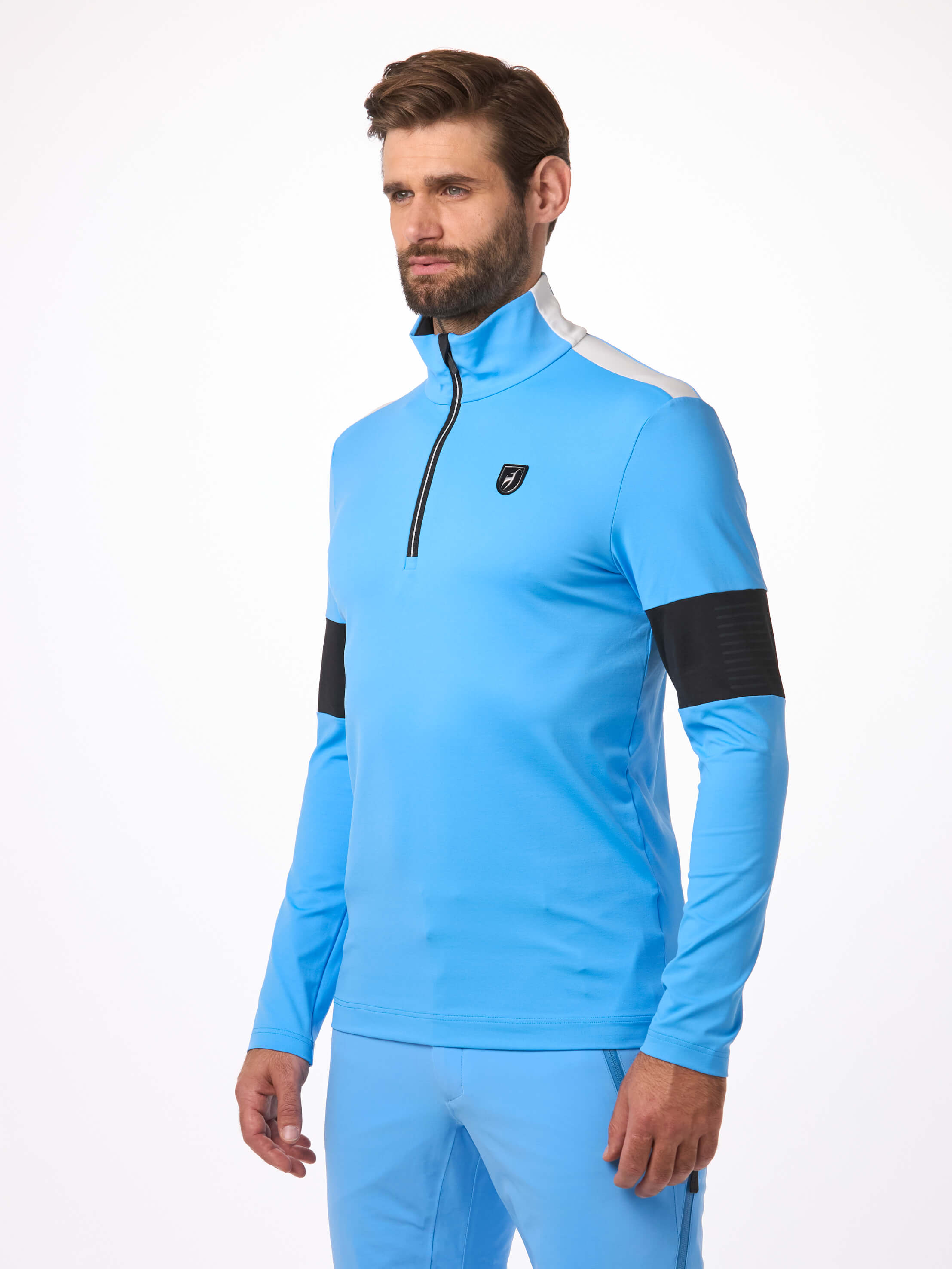 The VICTOR men’s first layer ensures high comfort due to its material properties. The functional jersey, made in France, is light, breathable, quick-drying, and offers high freedom of movement. Colour-contrasted inserts, and a two-tone YKK® zipper give this Toni Sailer base layer a sporty racing look that pairs perfectly with our jacket range.